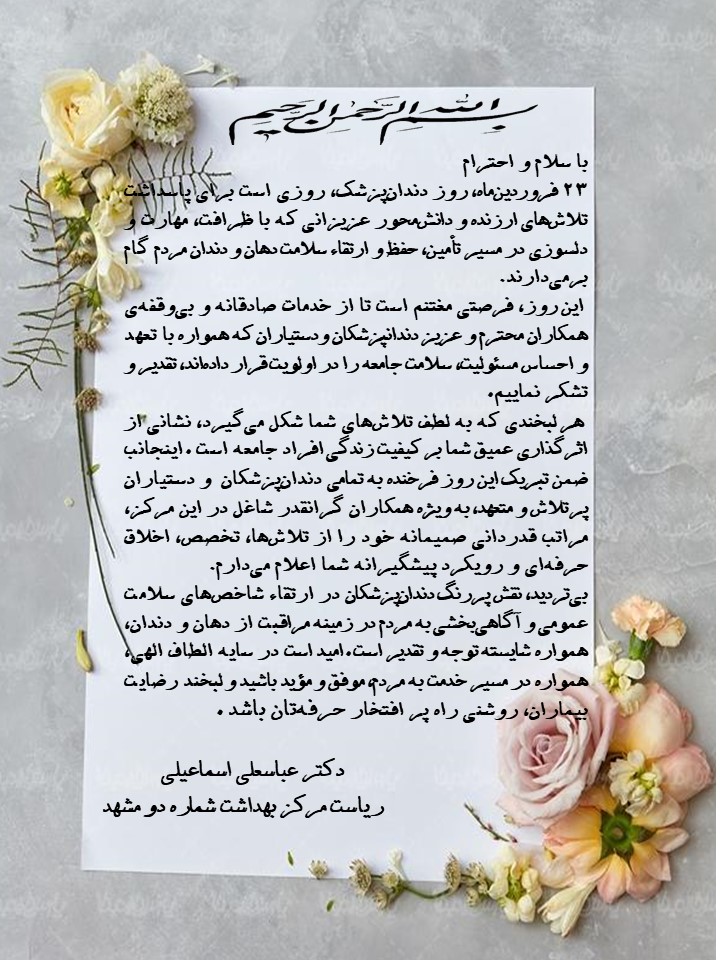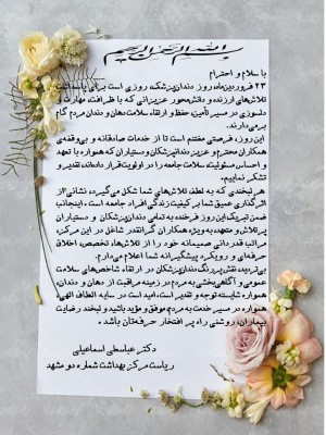 انعکاس عملکرد مرکز بهداشت شماره دو مشهد 23 فروردين 1404 بازدید: 25 امتیاز: ( 0 Rating ) پیام تبریک ریاست مرکز بهداشت شماره دو مشهد به مناسبت روز دندان پزشک امتیاز کاربران لطفا رای دهید رای 1 رای 2 رای 3 رای 4 رای 5 عکس نوشته عکس نوشته عکس نوشته