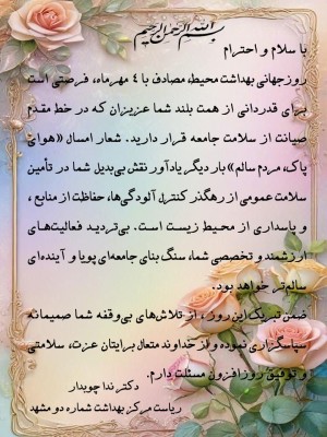 انعکاس عملکرد مرکز بهداشت شماره دو مشهد 04 مهر 1404 بازدید: 20 امتیاز: ( 0 Rating ) 4 مهر روز جهانی بهداشت محیط امتیاز کاربران لطفا رای دهید رای 1 رای 2 رای 3 رای 4 رای 5 پیام تبریک پوستر شبکه های اجتماعی پیام تبریک پوستر شبکه های اجتماعی پیام تبریک پوستر شبکه های اجتماعی متن شما ...