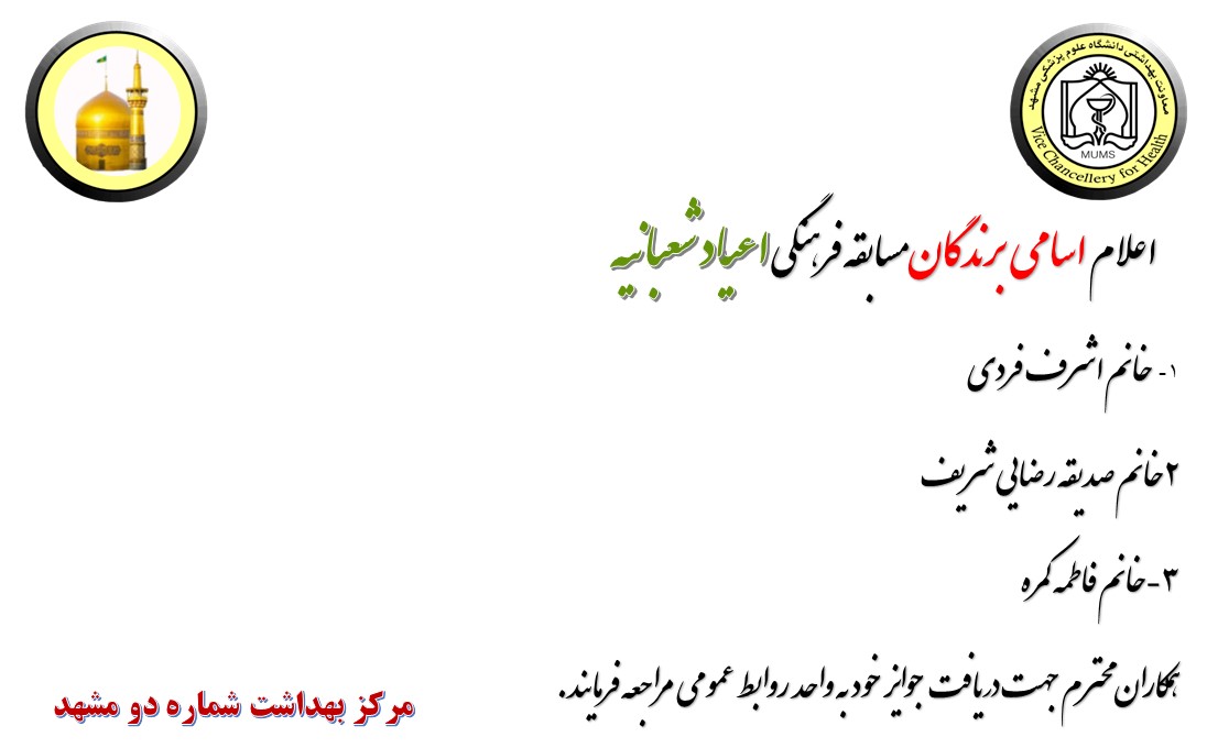 آقای دکتر غلامپور معاون فنی مرکز بهداشت شماره دو مشهد با اعلام این خبر افزودند 50 نفر از همکاران مرکز بهداشت شماره دو مشهد در این مسابقه شرکت کردند که 18 نفر موفق به کسب امتیاز کامل شدند. همزمان با ولادت کریم اهل بیت امام حسن(ع) در مراسمی به قید قرعه برندگان به شرح ذیل مشخص گردیدند.